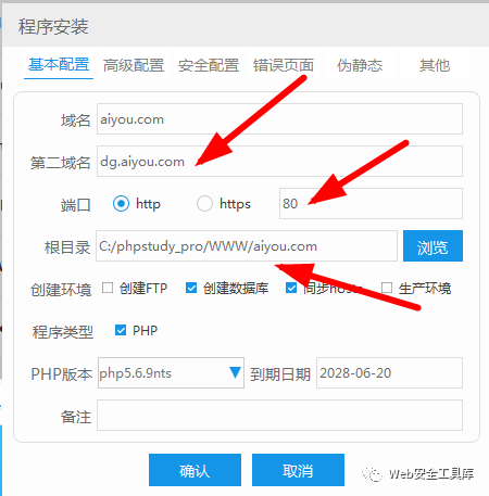 5、点击一键部署,通过设置二级域名也就是子域名、端口号、根目录实现同个服务器上搭建不同的网站