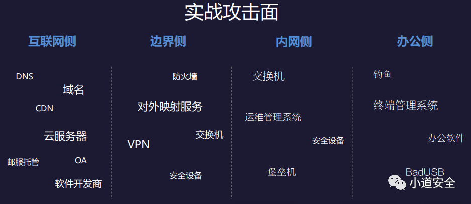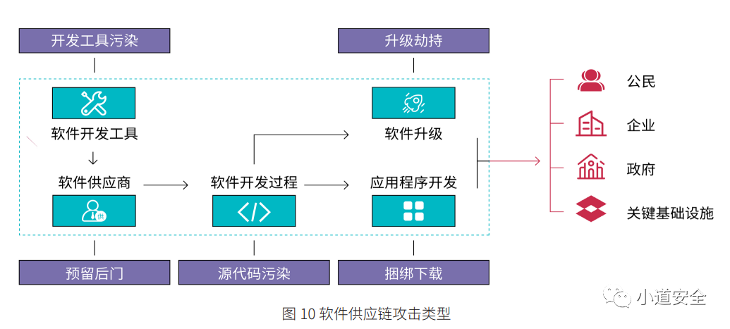 供应链攻击点有:供应链漏洞(0day、Nday等漏洞突破边界)、供应链后门(预留调试后门、内置口令)、供应链社工、供应链投毒。