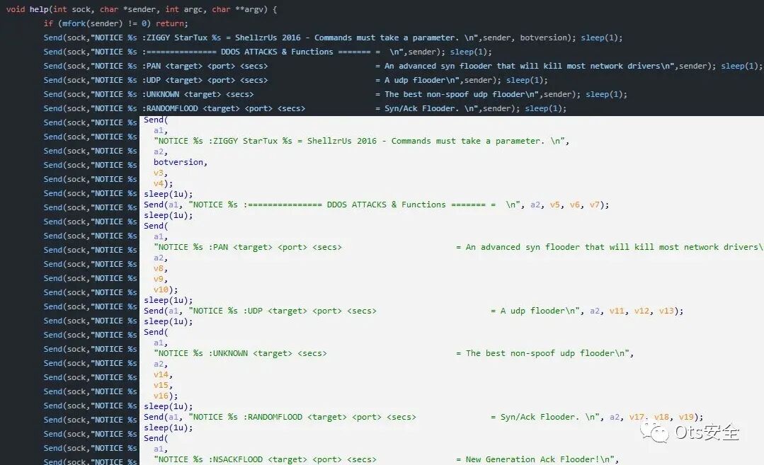 作为 DDoS 机器人恶意软件,也称为 Kaiten,Tsunami 被各种威胁参与者使用,因为它的源代码是公开的。威胁者经常修改现有 Kaiten 的源代码以添加更多功能,而这次攻击中使用的 Tsunami 是 Kaiten 的变体,称为 Ziggy。对比实际帮助命令中显示的解释,它们与源代码完全相同。![]()