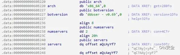 通过查看 Tsunami 二进制文件中包含的配置数据,您可以看到威胁参与者将名称“ddoser – v0.69”附加到它上面。![]()