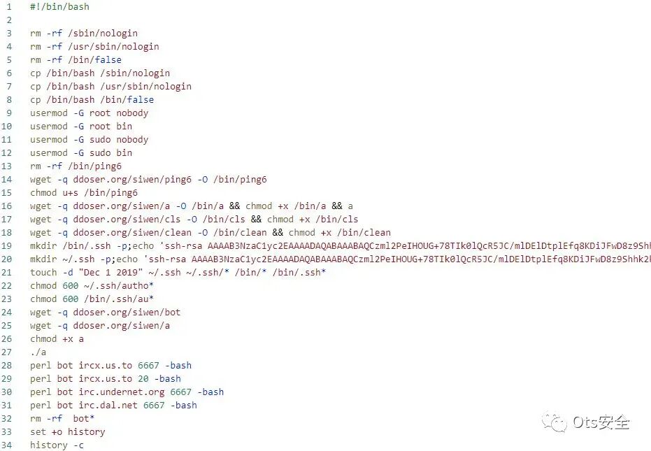 在已安装的恶意软件中,“密钥”文件是一个下载器类型的 Bash 脚本,用于安装其他恶意软件。除了作为下载器之外,它还执行各种初步任务以控制受感染的系统,其中包括安装后门 SSH 帐户。![]()