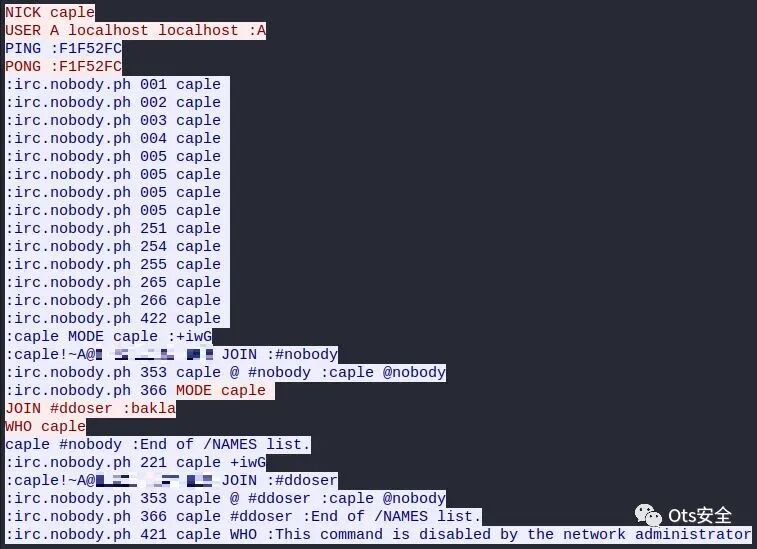 表 3. Tsunami 配置数据图 5. 登录 IRC 服务器的过程Tsunami 支持各种 DDoS 攻击命令以及基本的 IRC 命令。此外,它还提供了控制受感染系统的功能,例如系统信息收集、命令执行和反向shell。![]()