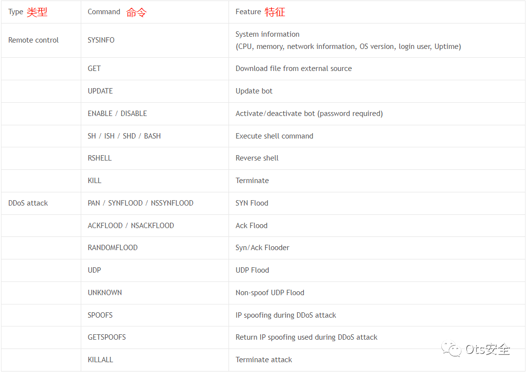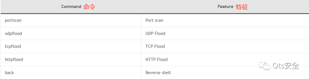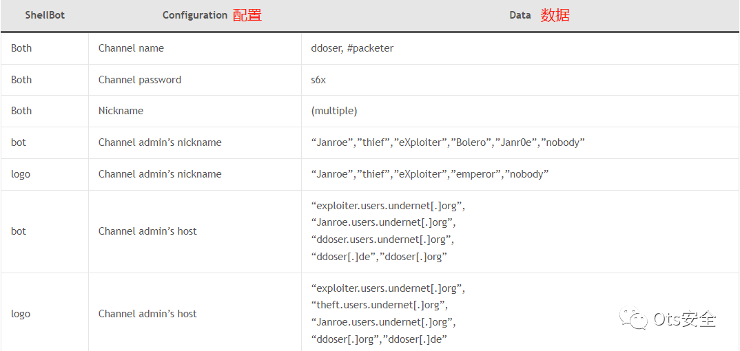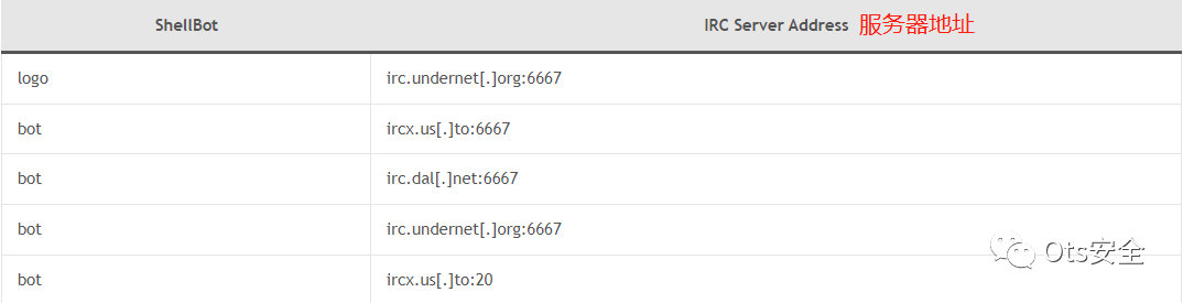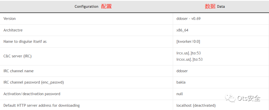 下表详细说明了 C&C 服务器地址中包含的各种配置数据。请注意,加入 IRC 服务器时使用随机字符串作为昵称。![]()