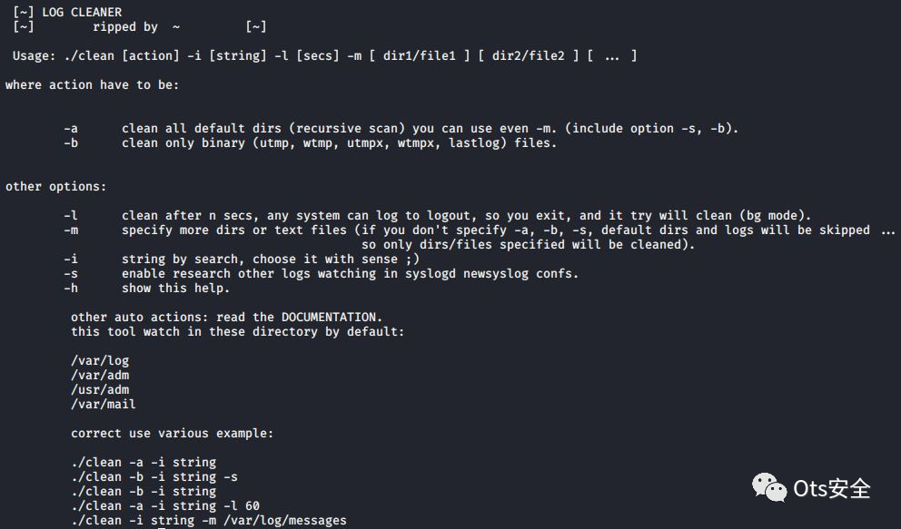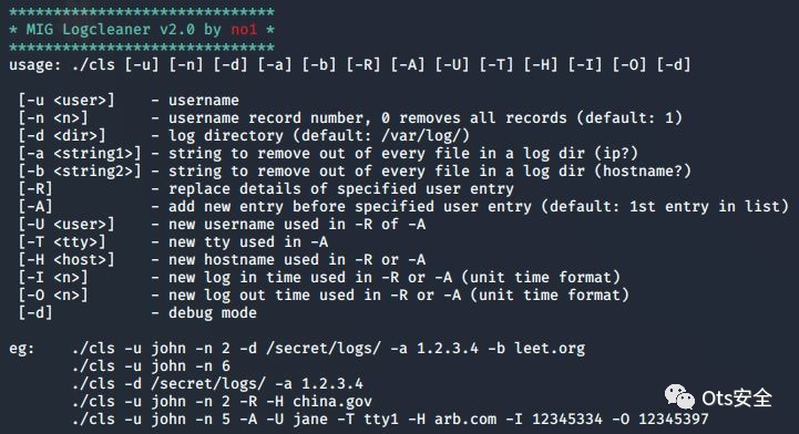 Log Cleaner 恶意软件存在于威胁行为者安装的恶意软件中。在 Linux 服务器环境中,有各种类型的日志文件记录用户或威胁参与者的活动。日志清理器是一种工具,可以删除或修改这些日志文件中的特定日志。据信,威胁行为者安装 Log Cleaner 的目的是阻碍对其违规行为的任何后续分析。在安装的文件中,“cls”是“MIG Logcleaner v2.0”,“clean”是“0x333shadow Log Cleaner”。对于初学者来说,MIG LogCleaner 能够接收各种选项作为参数,如下所示,以从 Linux、Unix 和 BSD 系统中删除所需的日志。![]()