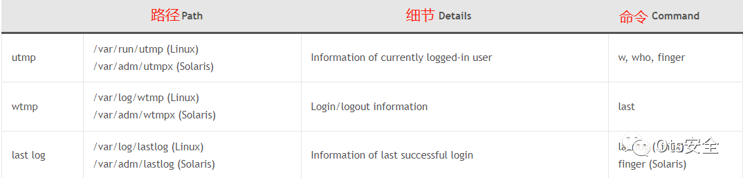 与登录 Linux 环境的用户相关的日志文件如下,威胁者可以操纵这些日志文件来删除或更改登录记录。![]()