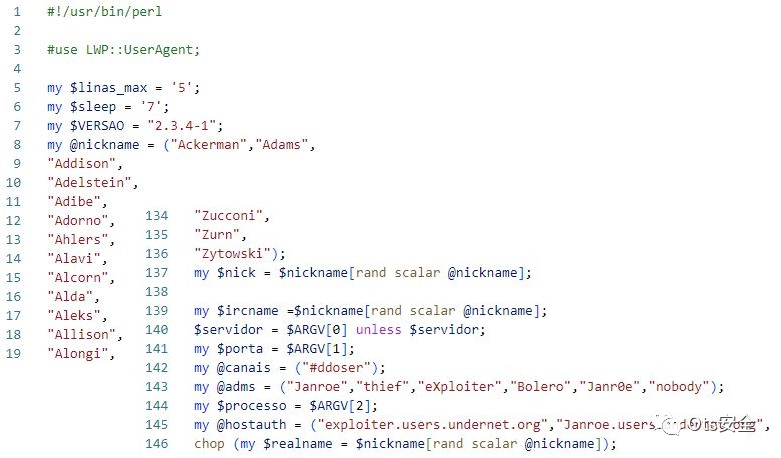 通过初始执行命令和Bash下载器“密钥”安装的“bot”和“logo”实际上是同一个ShellBot恶意软件。ShellBot 是一个用 Perl 开发的 DDoS 僵尸程序,它也是一个像 Tsunami 一样使用 IRC 协议的 IRC 僵尸程序。之前在 ASEC 博客上,对用于攻击管理不善的 Linux SSH 服务器的 ShellBot 恶意软件进行了分类和分析。[5]此次攻击中使用的 ShellBot 变种与上一篇文章中介绍的任何变种都不相同,但不可否认它们是 ShellBot 的变体。此次攻击中使用的 ShellBot 都是通过接收 C&C 服务器地址和端口号作为参数来运行的。以下是攻击中使用的 C&C 服务器地址列表。![]()