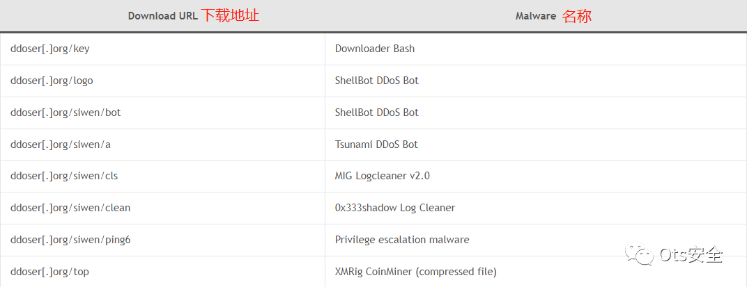 – ddoser[.]org/key: Downloader Bash script– ddoser[.]org/a : Tsunami– ddoser[.]org/logo : ShellBot– ddoser[.]o]rg/siwen/bot / ShellBot DDoS Bot– ddoser[.]org/top : Compressed XMRig CoinMiner file– ddoser[.]org/siwen/cls : MIG Logcleaner v2.0– ddoser[.]org/siwen/clean : 0x333shadow Log Cleaner– ddoser[.]org/siwen/ping6 : Privilege escalation malware