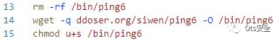 “key”Bash 脚本在安装“ping6”后设置 setuid。如果使用 root 帐户成功登录并且使用该帐户安装了“key”Bash 脚本,威胁者随后可以利用“ping6”来访问具有 root 权限的 shell。![]()