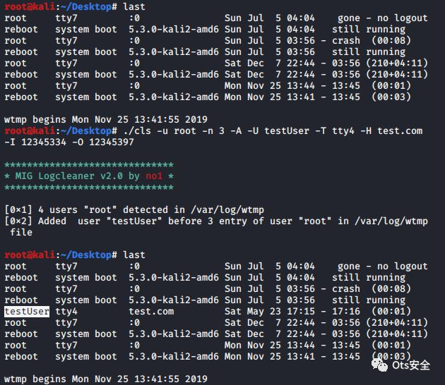 可以通过 MIG LogCleaner 修改各种日志文件。例如,它可以删除具有特定字符串的行、替换字符串或添加新字符串。此外,可以使用如下命令来添加登录记录。![]()