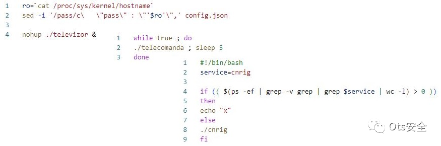 图 11. 设置 ping6 文件的 setuid 的例程在这个特定的攻击活动中,CoinMiner 还与 DDoS 机器人一起安装。通过字典攻击登录后执行的命令下载并解压缩一个名为 tar.tar 的压缩文件。然后执行生成的“go”文件。作为一个简单的 Bash 脚本,“go”执行位于同一路径中的“televizor”文件。“televizor”也是一个 Bash 脚本,它执行“telecomanda”Bash 脚本。这最终导致 XMRig CoinMiner“cnrig”被执行。![]()