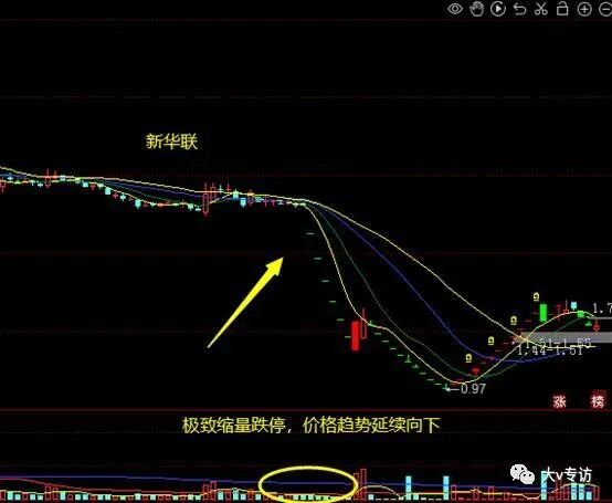 比如曾经的人气个股新华联,连续缩量一字跌停,价格趋势持续往下。