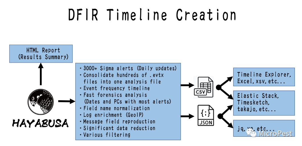 是这样介绍的:“Hayabusa is a Windows event log fast forensics timeline generator and threat hunting tool created by the Yamato Security group in Japan. ”