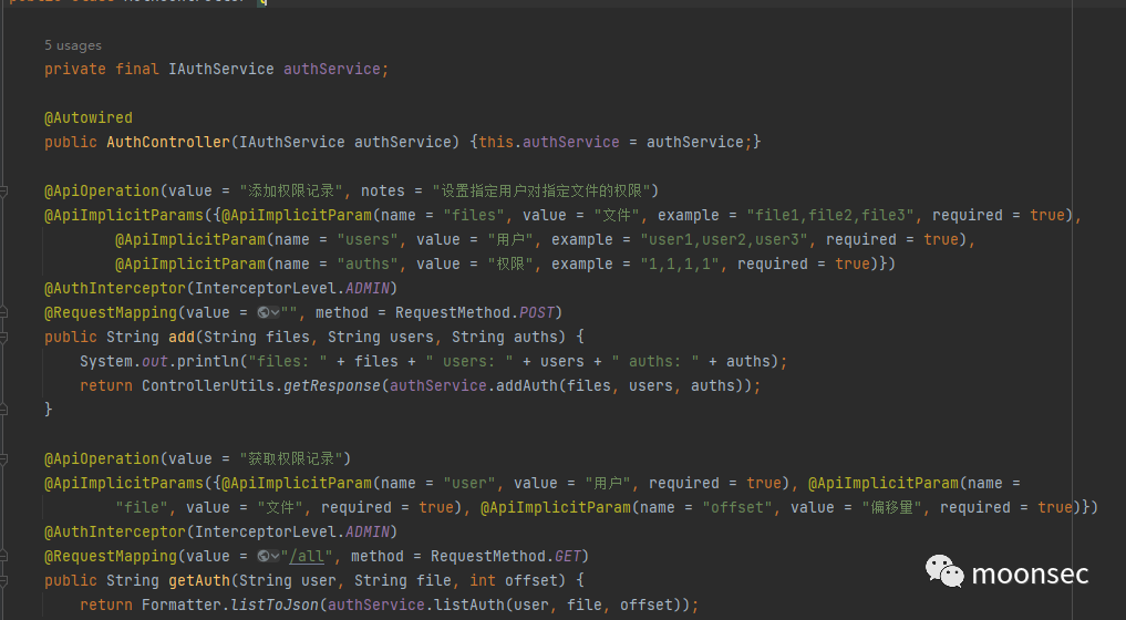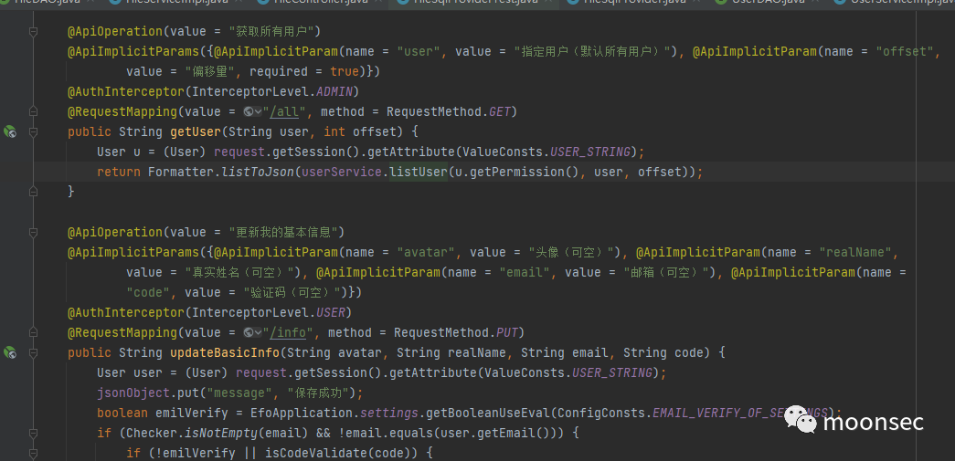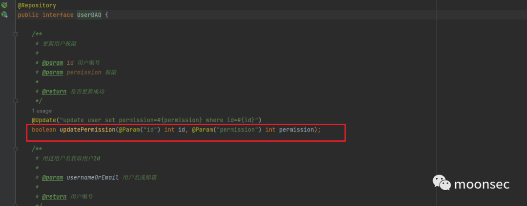 全局搜索关键字,然后定位到更新用户权限功能处。