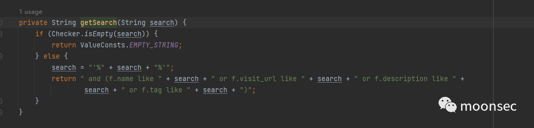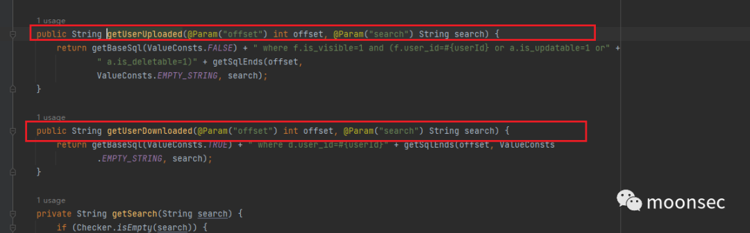 全局搜索关键字,然后去找到DAO⽂件,发现存在search用法。
