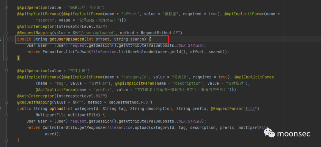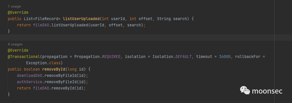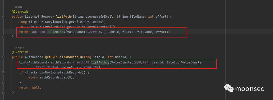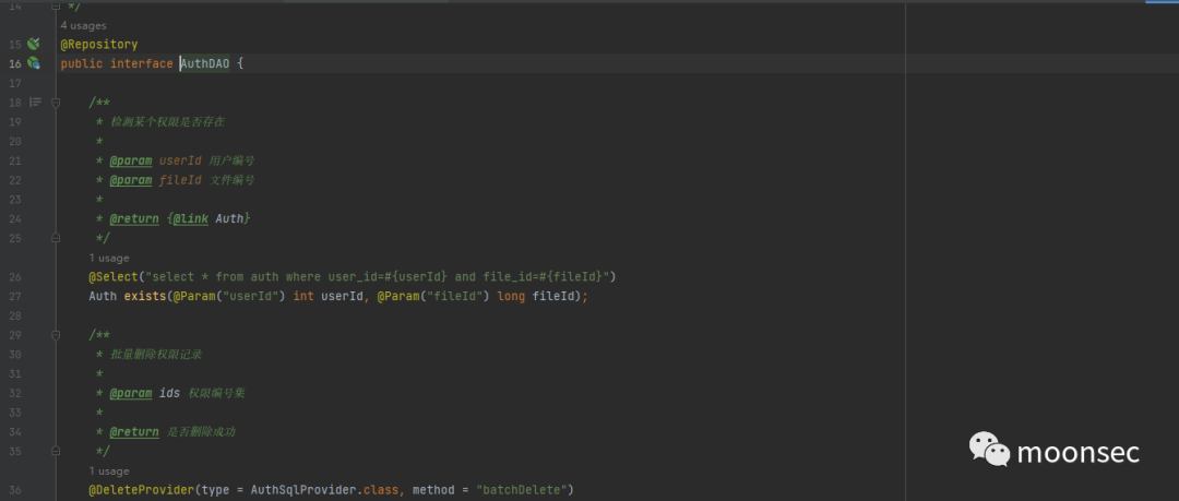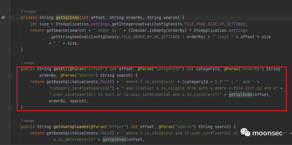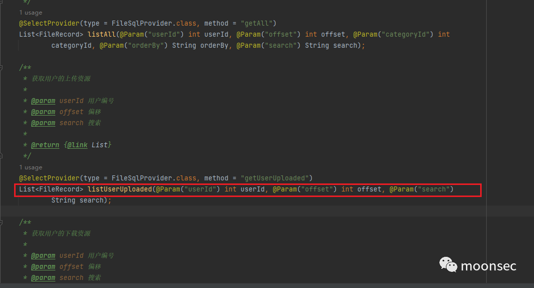 但fileDAO接⼝只有三个参数,主要查询代码,映射FileSqlProvider这个类的getUserUploaded⽅法。