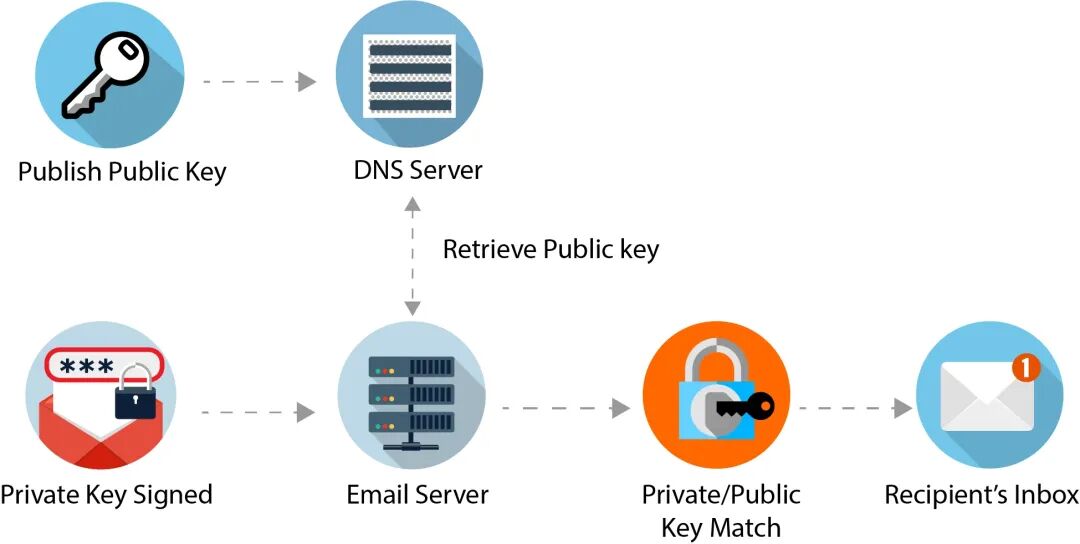 支持DKIM的邮箱发送的邮件都会生成一对公钥和私钥,私钥由发送者保存,公钥存放在From字段指定域名的txt记录中。邮件发送时,用私钥加密邮件头的某些字段,并附上邮件内容的hash值,让用户收到邮件时,查找此原来的公钥,对加密的内容进行解密。