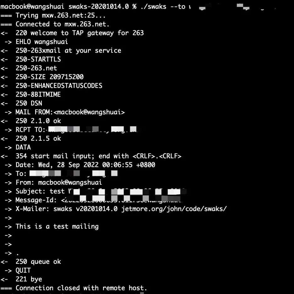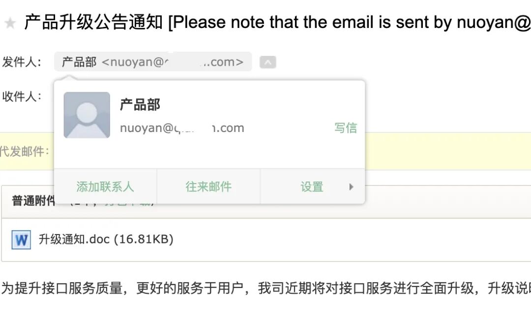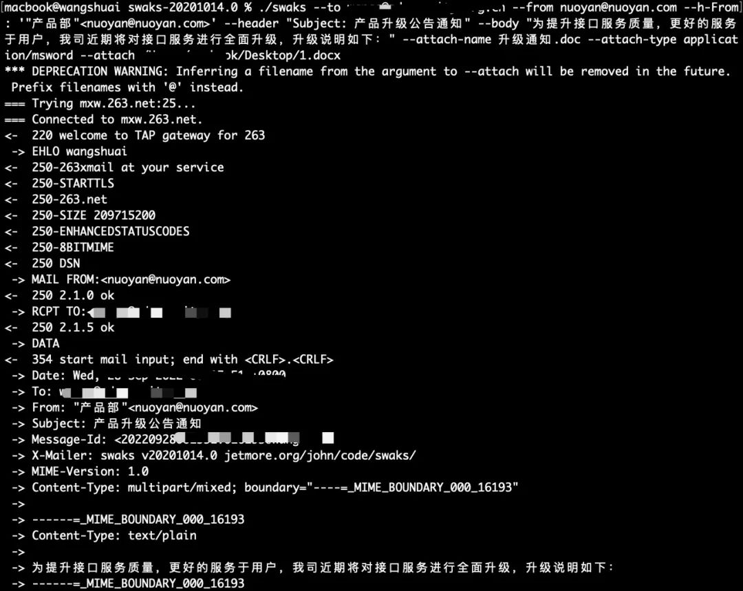swaks --to xxxx.com --from [email protected] --h-From: '"产品部"<[email protected]>' --header "Subject: 产品升级公告通知" --body "为提升接口服务质量,更好的服务于用户,我司近期将对接口服务进行全面升级,升级说明如下:" --attach-name 升级通知.doc --attach-type application/msword --attach /Users/macbook/Desktop/1.docx