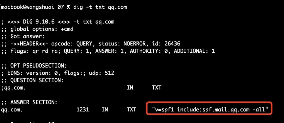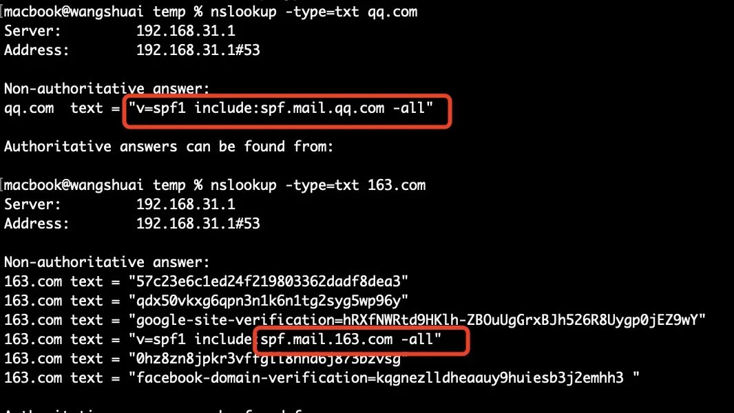要想查看一个域名是否配置了SPF,可以用nslookup或者dig查看: