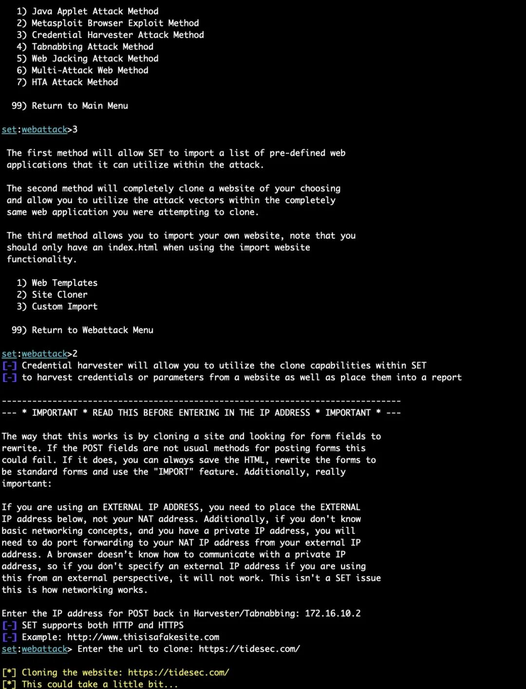 选择 2) Website Attack Vectors --> 3) Credential Harvester Attack Method --> 2) Site Cloner