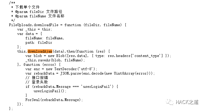 扫描目录得到http://xxxx/.idea/workspace.xml一个一个js文件看过去在fileUpload.js里面发现了文件下载功能 请求地址是this.downloadUrl然后参数是data接下来看哪里调用了这个方法downloadAjax,然后看到调用的地方得到两个参数一个fileName一个pathFileUploads.downloadUrl = Api.xxxxx + 'files/download'; // 下载路径(系统配置)