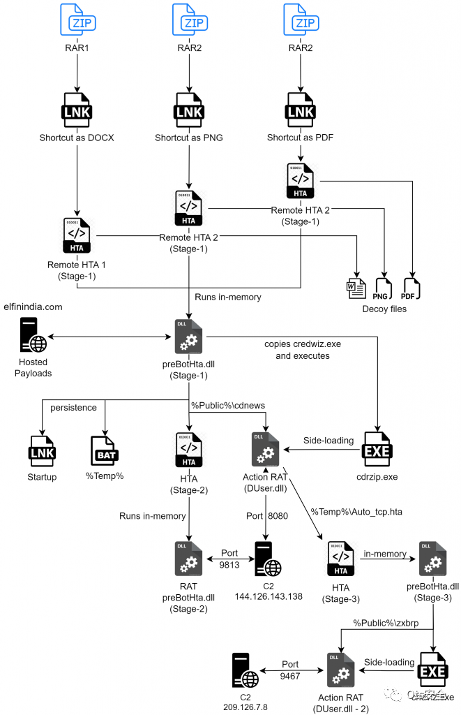 Archive05eb7152bc79936bea431a4d8c97fb7b Personal.zip4c926c0081f7d2bf6fc718e1969b05be Performa’s feedback.zipdb49c75c40951617c4025678eb0abe90 Asigma dated 22 May 23.zipLNK1afc64e248b3e6e675fa31d516f0ee63 pessonal pic.png.lnk49f3f2e28b9e284b4898fafa452322c0 Performa’s feedback.docx.lnkbecbf20da475d21e2eba3b1fe48148eb Asigma dated 22 May 23 .pdf.lnkHTAFCD0CD0E8F9E837CE40846457815CFC9 xml.htaBEC31F7EDC2032CF1B25EB19AAE23032 d.hta (Chain-1)C808F7C2C8B88C92ABF095F10AFAE803 d.hta (Chain-2)4559EF3F2D05AA31F017C02ABBE46FCB d.hta (Chain-3)F20267EC56D865008BA073DB494DB05E Auto_tcp.hta4F8D22C965DFB1A6A19B8DB202A24717 Auto_tcp.htaDLL86D4046E17D7191F7198D506F06B7854 preBotHta.dll (Stage-1)28B35C143CF63CA2939FB62229D31D71 preBotHta.dll (Stage-2) (New RAT)582C0913E00C0D95B5541F4F79F6EDD5 preBotHta.dll (Stage-3)8f670928bc503b6db60fb8f12e22916e DUser.dll (Action RAT)13D4E8754FEF340CF3CF4F5A68AC9CDD DUser.dll (Action RAT)5D5B1AFF4CBE03602DF102DF8262F565 DUser.dll (Action RAT)BATD95A685F12B39484D64C58EB9867E751 test.batBDA677D18E98D141BAB6C7BABD5ABD2B test.batOthers5580052F2109E9A56A77A83587D7D6E2 d.txtE5D3F3D0F26A9596DA76D7F2463E611B h.txtDomainelfinindia[.]com Hosted Malicious filesIP144.126.143[.]138:8080144.126.143[.]138:981366.219.22[.]252:9467209.126.7[.]8:9467C2URLhxxps://elfinindia[.]com/wp-includes/files/hxxps://elfinindia[.]com/wp-includes/files/pictures/personal/Personal.ziphxxps://elfinindia[.]com/wp-includes/files/pictures/man/d.htahxxps://elfinindia[.]com/wp-includes/files/man/d.htahxxps://elfinindia[.]com/wp-includes/files/fa/d.htahxxps://elfinindia[.]com/wp-includes/files/oth/hl/h.txthxxps://elfinindia[.]com/wp-includes/files/oth/dl/d.txthxxps://elfinindia[.]com/wp-includes/files/oth/av/PDBE:\Packers\CyberLink\Latest Source\Multithread Protocol Architecture\side projects\First Stage\HTTP Arsenal Main\Clinet\app\Release\app.pdbEXE (Legitimate)9B726550E4C82BBEB045150E75FEE720 cdrzip.exe / cridviz.exeDecoy FilesC5C2D8EB9F359E33C4F487F0D938C90C Invitation Performa vis a vis feedback.docx2461F858671CBFFDF9088FA7E955F400 myPic.jpegD77C15419409B315AC4E1CFAF9A02C87 2696 – 22 May 23.pdf