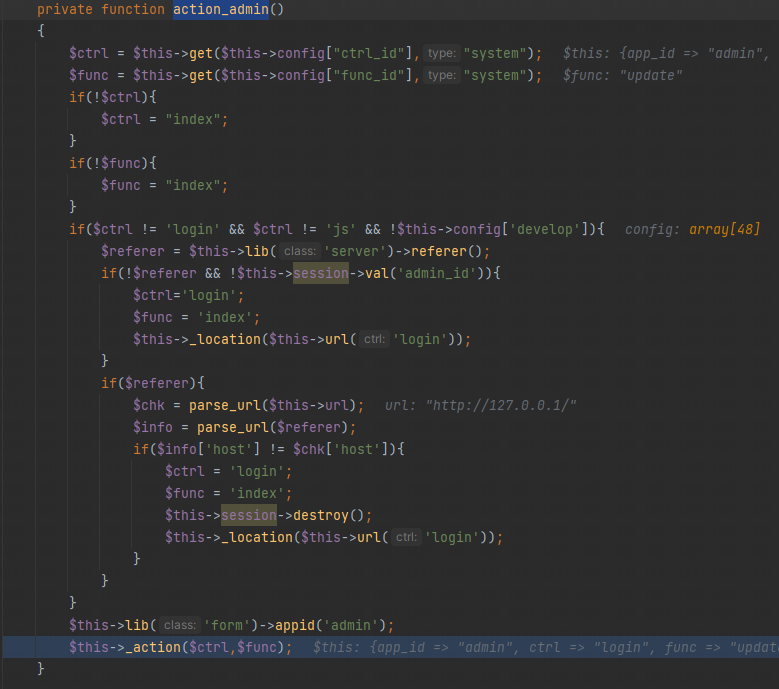 我们以action\_admin为例,$ctrl和$func分别通过get请求中的c和f获取,默认值为index