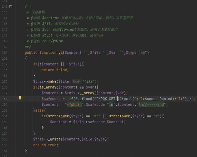 在最新版本中已修复该漏洞,修复方式就是将vim改成vi,在vi中会在最前面添加if(!defined("PHPOK_SET")){exit("<h1>Access Denied</h1>");}即使后面有php代码也不会执行。