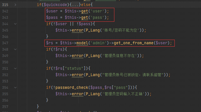 当没有传入quickcode参数时,需要传入user和pass,然后将user带入数据库查询相关信息并验证账号密码是否正确,但是,由于这里传入的时明文,尖括号,引号等特殊字符会被进行编码过滤,所以这里进行sql注入或者写入shell。