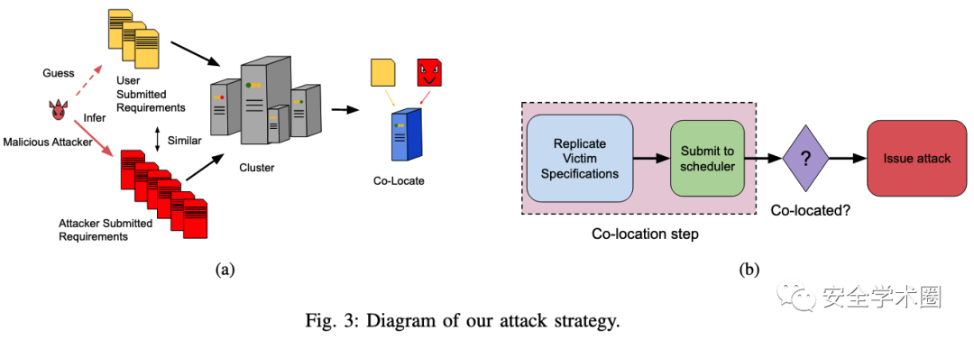 攻击者通过利用云调度器的特征,例如允许用户提交节点的附加要求和偏好以及应用程序共存列表,来影响云调度器的资源分配结果,从而将攻击实例与目标受害实例托管在同一物理节点上。攻击者通过复制目标受害用户给出的要求来增加托管到目标物理节点的概率。同时为了提高攻击实例的传播率,还利用了anti-affinity特性将所有攻击实例进行传播。,以提高攻击实例与受害实例的共址率。