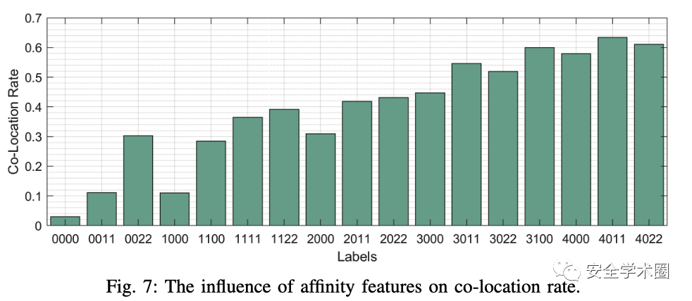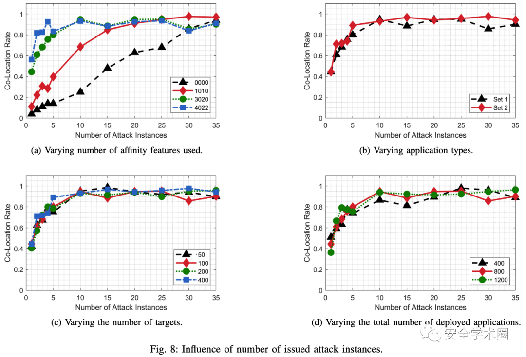 在集群环境的实验中,随着攻击者提供的需求清单与受害实例的清单相似性增加,以达到更相似的亲和力特征,共定位率会增加。通过只发出单个攻击实例,托管率可以达到高达 60%。