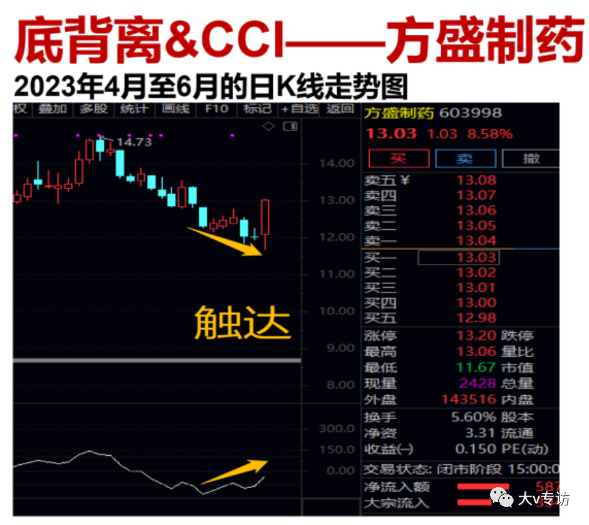 上图是方盛制药2023年4月至6月的日K线走势图,可以看到股价还在下跌,但CCI指标是向上运行的,形成了背离,在6月21日股价与指标再次同步形成了买点的。