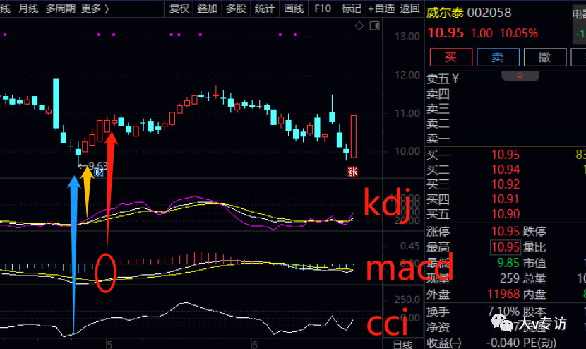 上图同样是威尔泰2023年3月至5月的日K线走势图,可以看到股价在底部的连续两天下跌对应的CCI指标是快速向上因而形成背离,当第三天不再下跌了,指标和股价迎来了同步的报复性上涨形成买点,而且通过上图大家可以清楚辨识,KDJ只有在急速的行情中能够清楚辨识,因此CCI快速指标捕捉背离是有优势的。实际上CCI指标当初是应用在急速变化的期货市场上,因此对于行情没有期货那么动荡的股票市场,CCI指标还是有很多优点的,捕捉背离是比较实用的指标。