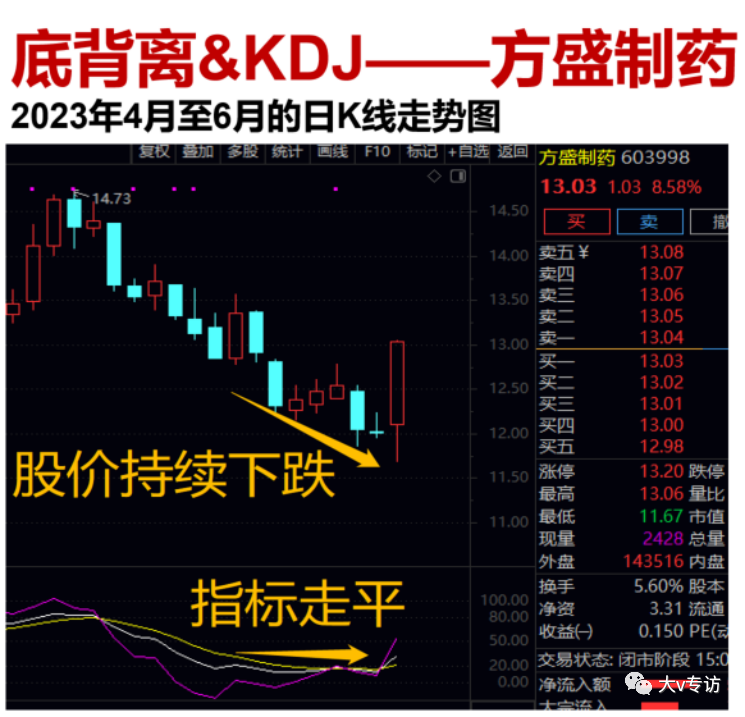 上图是方盛制药2023年4月至6月的日K线走势图,可以看到股价还在下跌,KDJ指标已经出现走平形成背离,在6月21日出现股价与指标一起回升的上涨行情。