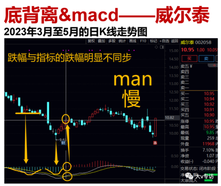 上图是威尔泰2023年3月至5月的日K线走势图,可以看到股价大幅下跌的情况下,MACD的绿柱并没有同步出现长长的绿柱,尽管底部的绿柱还是比前期的绿柱要长,但明显价格的跌幅与绿柱的长度是不匹配存在背离的。若以出现买点的情况来评价,MACD出现红柱买点的时候,是反弹第一波的高点附近了,错过了抄底的机会,但这种情况并不是MACD不行,相反是MACD有判断趋势的作用,所以才会表现得如此慢,背离现象能明显判断,但买点出现较晚,这是MACD的不足之处。