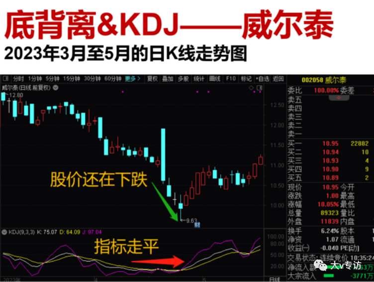 上图是威尔泰2023年3月至5月的日K线走势图,可以看到股价还在下跌,KDJ指标已经出现走平形成背离,在4月26日出现股价与指标一起回升的上涨行情,所以背离现象还是有必要学习认识的。这在实践过程中有助投资者判断买点与卖点,是不错的辅助指标。