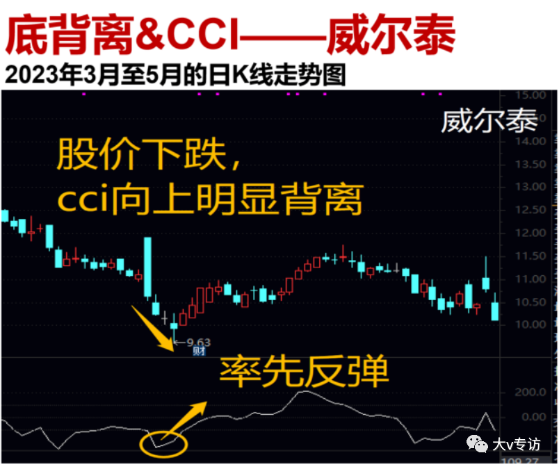 上图是高斯贝尔2023年3月至5月的日K线走势图,可以看到股价大幅下跌的情况下,CCI指标并没有同步走低,而是出现了横向运行,出现了明显的背离,在4月26日股价与指标再次同步向上,形成了抄底买点。