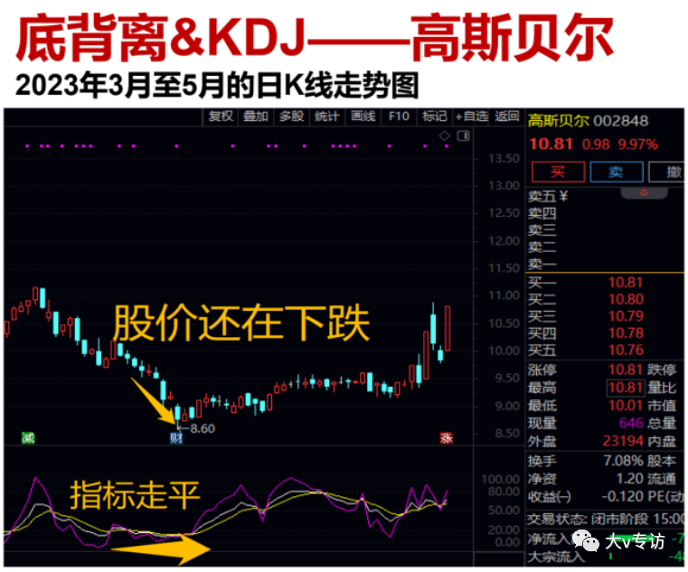 上图是高斯贝尔2023年3月至5月的日K线走势图,可以看到股价还在下跌,KDJ指标已经出现走平形成背离,在4月28日出现股价与指标一起回升的上涨行情。所以读者假设想关注该标的,在4月28日就出现了低位后的买点关注点!