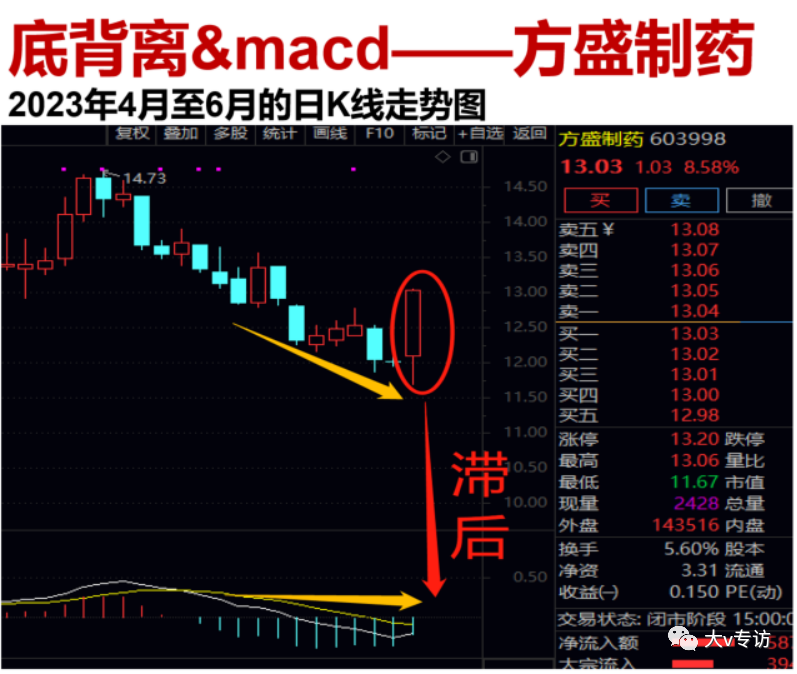 上图是方盛制药2023年4月至6月的日K线走势图,可以看到股价还在下跌,但MACD的绿柱并没有增长,而是比前低的绿柱要小,因此形成了背离。而这个例子MACD似乎的买点的红柱还没有出现,个股就已经急速反弹了。
