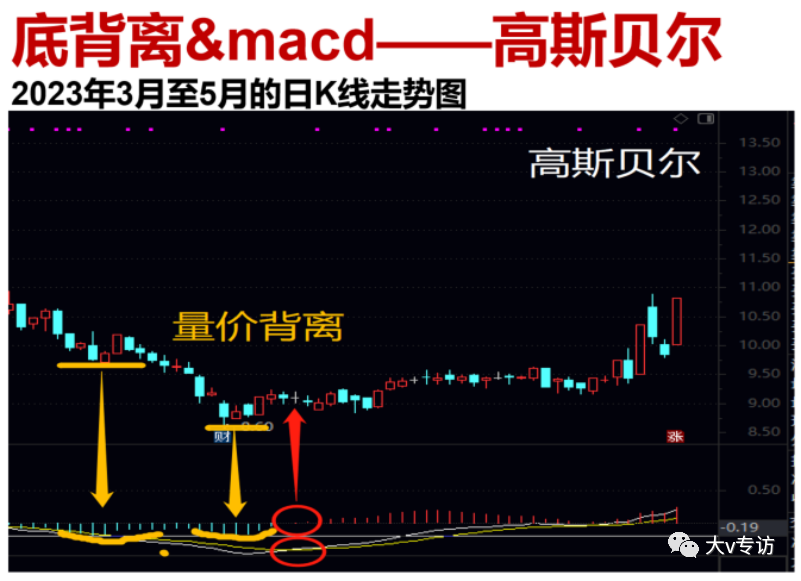 上图是高斯贝尔2023年3月至5月的日K线走势图,可以看到股价大幅下跌的情况下,MACD并没有出现更长的绿柱,而是和前期底点的绿柱差不多长度,存在量价背离。虽然在判断底背离出现的时候与KDJ差异不大,但买点似乎还是来得比较晚。