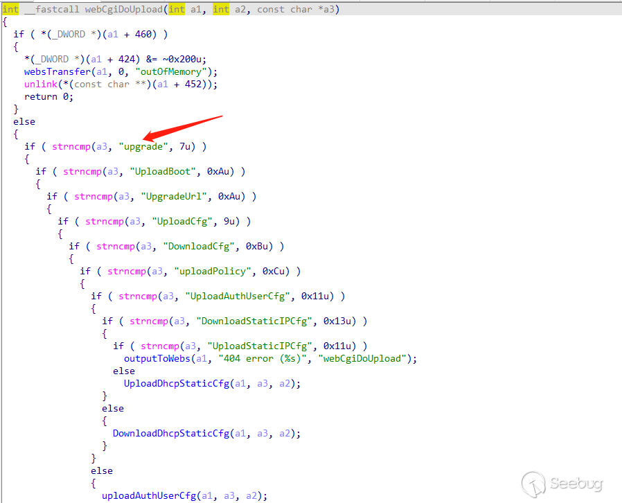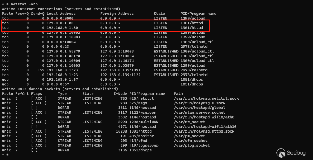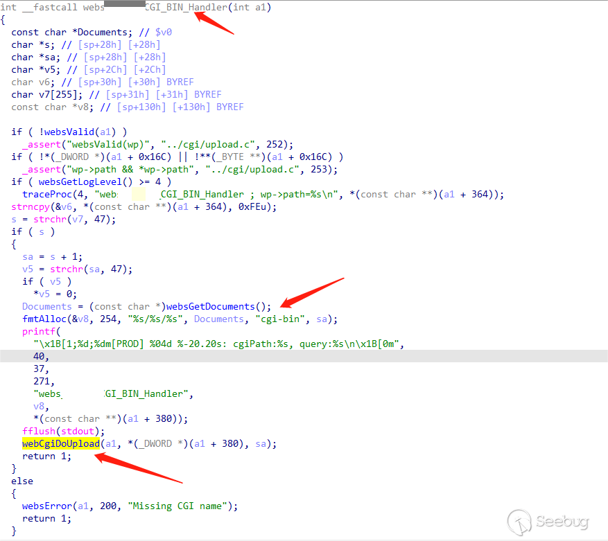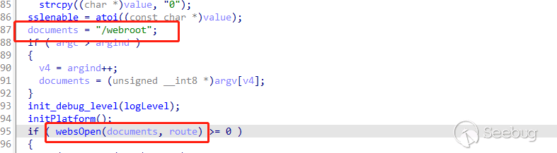int __cdecl main(int argc, const char **argv, const char **envp){...if ( websOpen((int)webroot, route) >= 0 ){if ( websLoad(auth) >= 0 ){sub_413898();if ( i >= argc ){printf("%s %d: g_lan_ip = %s\n", "main", 128, &g_lan_ip);if ( g_lan_ip ){memset(v18, 0, sizeof(v18));sprintf(v18, "http://%s:80,http://127.0.0.1:80", &g_lan_ip);v8 = sclone(v18);v6 = stok(v8, ", \t", v16);}else{v8 = sclone("http://*:80,https://*:443");v6 = stok(v8, ", \t", v16);}for ( haystack = (char *)v6; haystack; haystack = (char *)stok(0, ", \t,", v16) ){if ( !strstr(haystack, "https") && websListen(haystack) < 0 )return -1;}}...}int __fastcall websListen(_BYTE *a1){...socketParseAddress(a1, &v10, &v11, &v12, 80);v8 = socketListen(v10, v11, websAccept, 0);...}