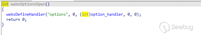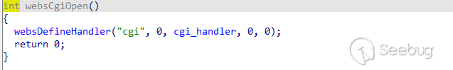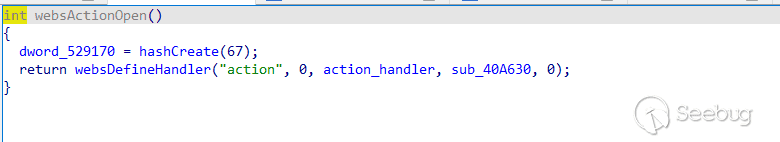 int __fastcall websOpen(int a1, const char *a2){...websOsOpen();websRuntimeOpen();logOpen();sub_423E40();socketOpen();...if ( websOpenRoute() < 0 )return -1;websCgiOpen();websOptionsOpen();websActionOpen();websFileOpen();if ( websOpenAuth(0) < 0 )return -1;initWebDefine();old_main_init();websFsOpen();if ( websLoad(a2) < 0 )return -1;dword_5389D8 = hashCreate(268);...for ( i = off_5294B0; *i; i += 2 ){v3 = dword_5389D8;v4 = i[1];valueString(v6, *i, 0);hashEnter(v3, v4, v6[0], v6[1], v6[2], v6[3], 0);}return 0;}