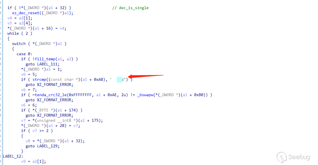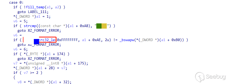 static enum xz_ret dec_stream_header(struct xz_dec *s){if (!memeq(s->temp.buf, HEADER_MAGIC, HEADER_MAGIC_SIZE)) //HEADER_MAGIC = '\xfd7zXZ'return XZ_FORMAT_ERROR;if (xz_crc32(s->temp.buf + HEADER_MAGIC_SIZE, 2, 0)!= get_le32(s->temp.buf + HEADER_MAGIC_SIZE + 2))return XZ_DATA_ERROR;...}