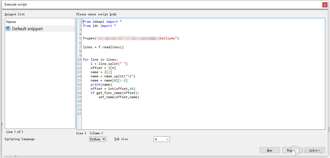 from idaapi import *from idc import *f=open("kallsyms")lines = f.readlines()for line in lines:l = line.split(" ")offset = l[0]name = l[2]name = name.split("\t")name = name[0][:-1]print(name)offset = int(offset,16)if get_func_name(offset):set_name(offset,name)