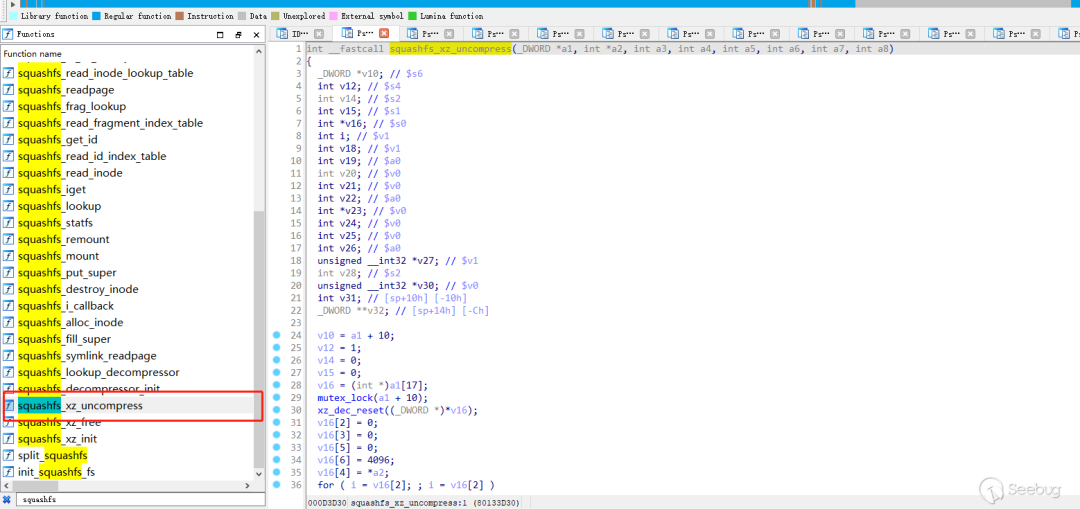 某T路由器固件的解压逻辑即将解压逻辑写入linux内核中,在内核系统启动过程中,会将要更新的文件系统解压出来,解压过程有自修改后的文件系统头和xxx_crc32_le等函数校验过程,所以想要直接使用binwalk之类的工具提取固件中的文件系统会失败,要想解压出文件系统需要绕过crc校验函数或者对xz工具中的crc32_fast.c中lzma_crc32函数进行修改。
