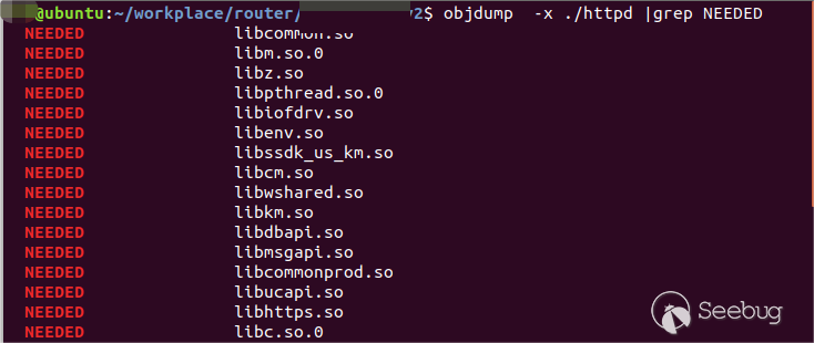 objdump -x httpd | grep NEEDED