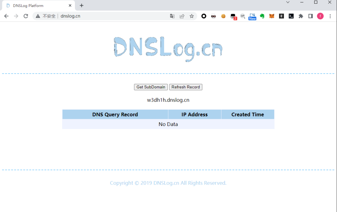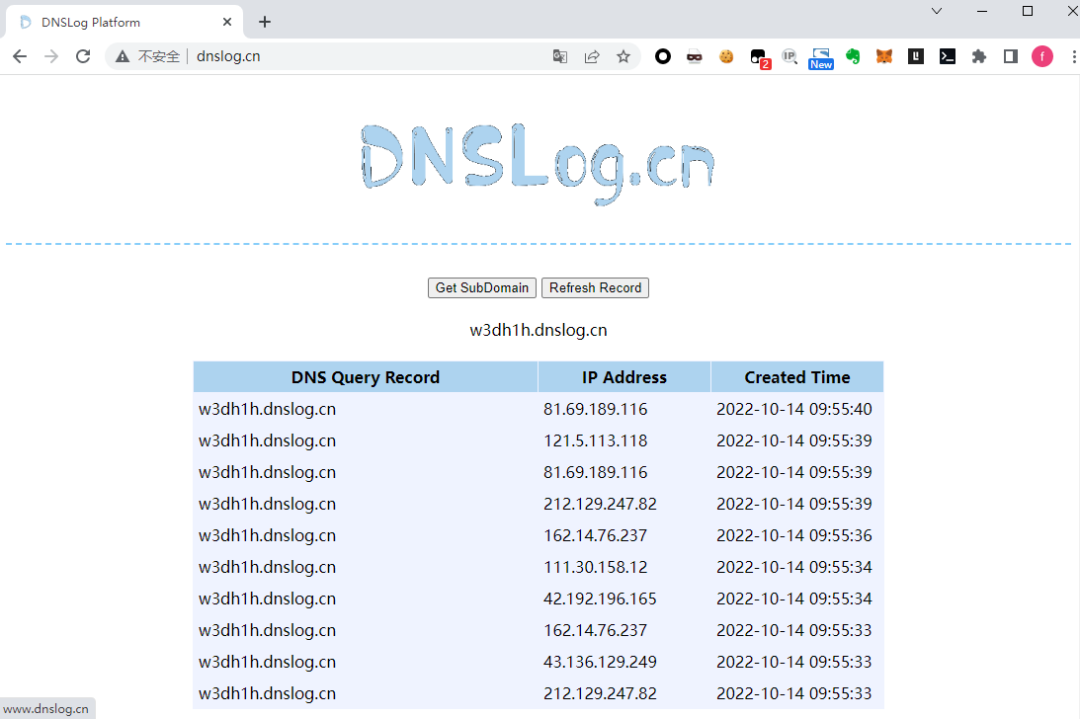 在不确定目标是否通外网的情况下 先使用DNSLOG进行检测 获取一个新的域名 :w3dh1h.dnslog.cn