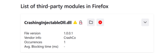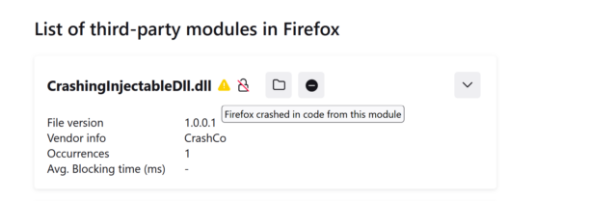 在Firefox 110中,用户可以阻止第三方dll加载到Firefox中。这可以在about:third-party上完成,该页面已经列出了所有加载的第三方模块。about:third-party还显示了哪些第三方DLL与之前的Firefox崩溃有关,还有就是DLL发布者的信息也会显示,希望这能让用户在知情的情况下决定是否阻止DLL。下面是一个最近导致Firefox崩溃的DLL示例,点击带有破折号的按钮将阻止它: